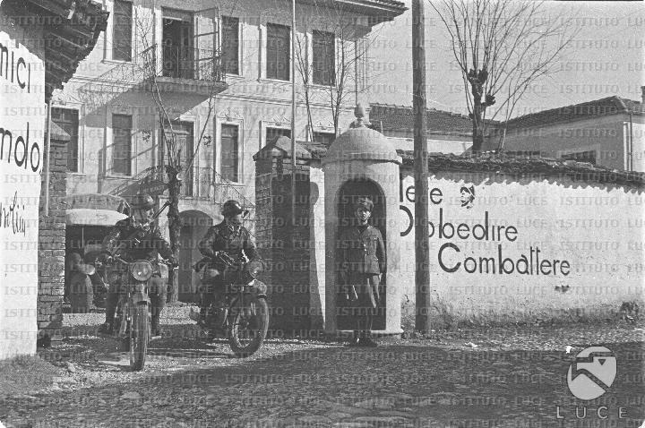 Tirana 29.01.1940 Dy ushtarakë në motoçikleta po largohen nga një kazermë. Burim informacioni: https://patrimonio.archivioluce.com/luce